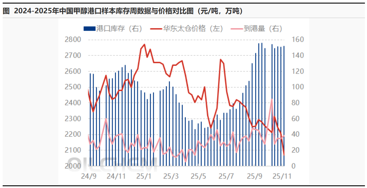 截至2025年11月5日,中国甲醇港口库存总量在151.71万吨,较上一期数据增加1.06万吨。其中,华东地区累库,库存增加2.42万吨;华南地区去库,库存减少1.36万吨。