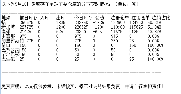 LME 5月16日铅库存分布情况
