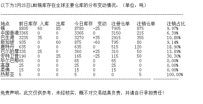 LME 3月25日锡库存分布情况