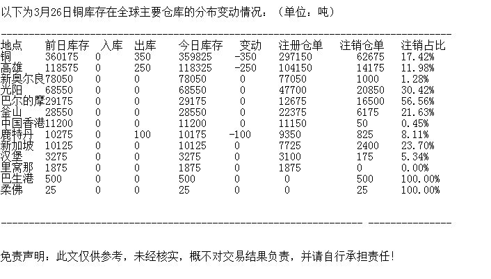 LME 3月26日铜库存分布情况